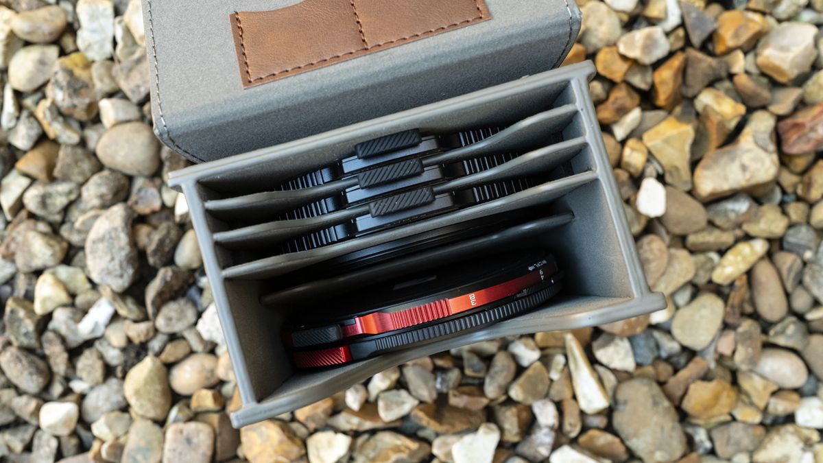 مشكلتي البسيطة مع مجموعة Mega Kit هي أنه عندما يتم إدخال مرشحات ND32 واثنين من مرشحات الضباب في علبة المرشحات الجلدية الذكية مع مشبك مغناطيسي، تكون المرشحات الوسطى والخلفية مشدودة قليلاً عند إزالتها من العلبة. ومع ذلك، فإن العلبة مصنوعة جيدًا وتخزن المجموعة بأكملها بأمان.